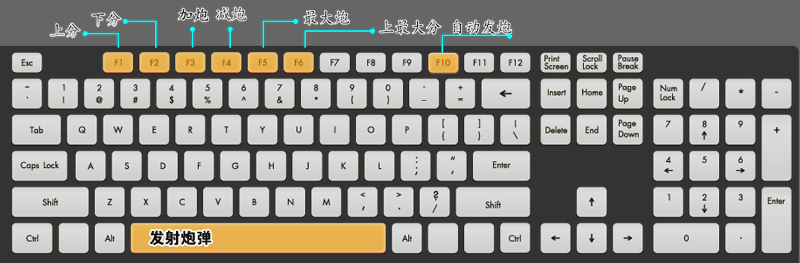 另外,按下键盘上的空格键也可以发射炮弹。按F1上分(单次操作为加或减2000炮弹),按F2下分(下所有分)。按F3加强炮弹, 按F4减弱炮弹(从25—1000【高级桌750-30000】之间,每次增加或减少的量都为25【高级桌250】)。按F5上最强炮弹(最强炮弹威力为1000【高级桌30000】)。按F6上最大分(最大分为当前你所有的金币数额)。按F10自动发炮。